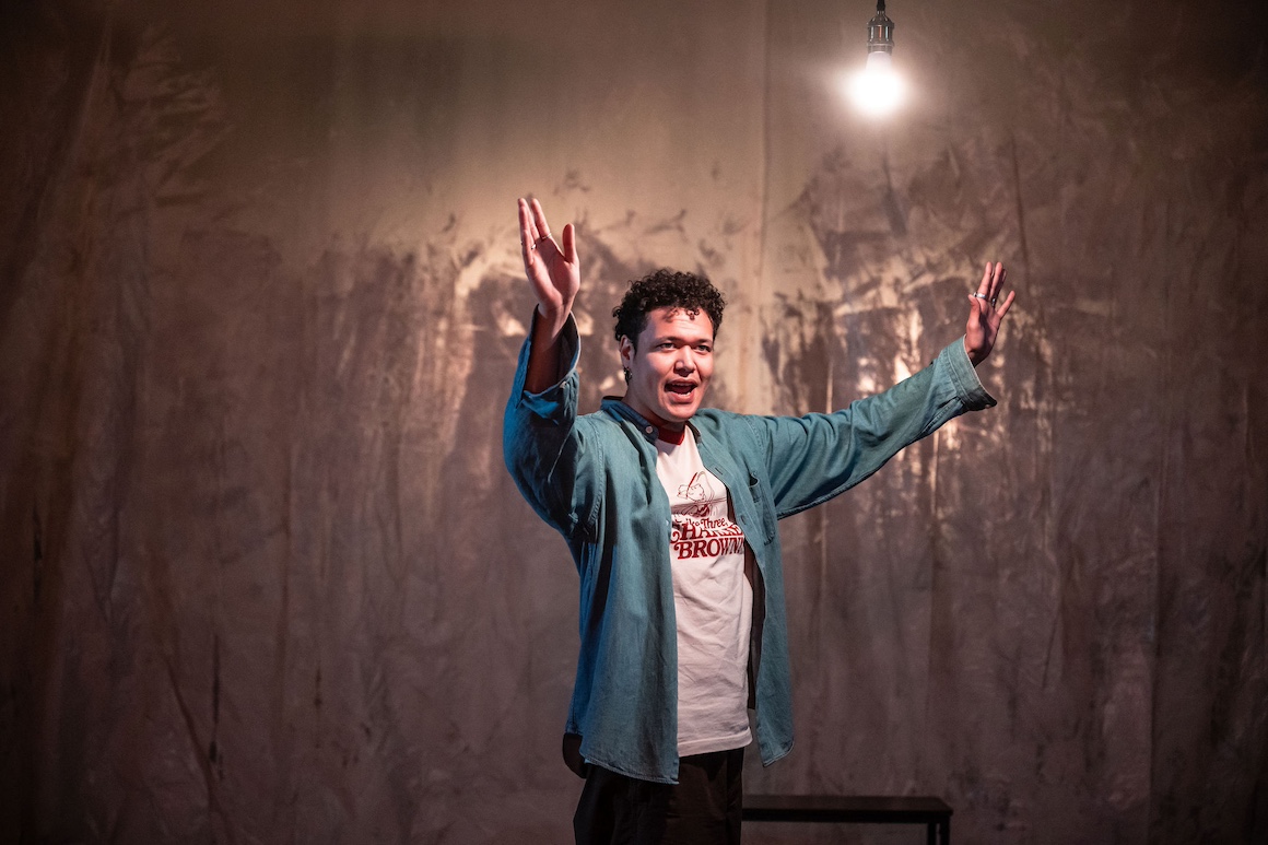 I’ve heard a lot of good things about Barrie’s Talk is Free Theatre so I was very happy to be able to catch one of their shows on tour in Toronto. The show is Tales of an Urban Indian and it’s playing in the basement of Hope United Church on the Danforth. I think the show originally toured on a converted bus which would explain the set up; which is a narrow space with a row of chairs either side (actually two rows on one side) so the space seats about thirty five. It’s been around since 2009 and has toured across Canada, the US and overseas nad, despite the things that have happened on the “Reconciliation” agenda since then it still feels fresh and timely.