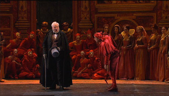This is another of those Arthaus Blu-ray disks that’s sold at a silly cheap price as a carrier for two hours of trailers from the Arthaus catalogue. That said, it’s very high quality indeed. GIlbert Deflo’s production is, in the end, quite conventional though with careful and effective Personenregie. He does trick us a bit at the start. The scene opens with what is, apparently, a rather louche 16th century court entertainment/orgy. There are bare breasted women and dancers of both sexes dressed as Satanic imps. Everyone is in period costume including Rigoletto with jester hat, bells etc. The scene is, perhaps, what we expect. The “ladies” are very receptive to the duke’s advances. The men are resentful but not actively so. Then in comes Monterone in mid 19th century dress to denounce the proceedings and we, perhaps slowly, realise that this is a costume party. From there on there’s nothing very tricksy. The story gets told effectively and straightforwardly. We have been pulled, effortlessly, from the time of the libretto to the time of first performance and the parallels are drawn.