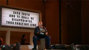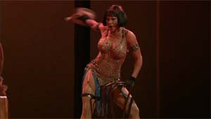 It’s a shame because the singing performances are mostly very good. The leading female roles are played by Patti LuPone and Audra McDonald who both have Broadway backgrounds. LuPone sounds like that’s where she’s from too though McDonald manages a much wider range and pretty much steals the show. It helps that she is very good looking and practically naked. The guys are mostly from opera backgrounds; notably Anthony Dean Griffey as Jimmy McIntyre and Donnie Ray Albert as Trinity Moses. Both sing well and idiomatically. The sets are sort of Vegas lite with none of the inexplicable weirdness of the Salzburg production but not much interest either. Again things look up a bit in the last act with effective use of a giant video screen in the trial scene and moving slogans over the finale. Blocking is very Broadway, especially the big chorus numbers that look more Rodgers and Hammerstein than Brecht and Weill.