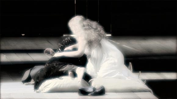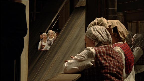 Maybe it’s the essential dullness of the production that causes video director Andrea Bevilacqua to take the approach he does, which is highly interventionist. Sometimes we get to see the action more or less as the theatre audience does but often we get extreme closeups or weird angles; backstage, side stage, from the pit, the works. He also indulges in some video trickery. At least I think that’s what’s happening in the scene with Boris’ ghost which is very white and somewhat out of focus. I don’t think the effect could be produced with stage lighting. In Act 4 Bevilacqua also pulls out the fades, dissolves and superpositioned shots. As a video in its own right it is quite interesting. As a record of a stage production it largely fails so whether one likes it or not becomes largely a question of point of view on what a video recording of a live opera performance should be. The disk includes an introductory credits sequence which involves what appear to be black and white portraits of the cast put through Photoshop’s oil painting filter. It really is a taste of things to come.