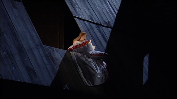 I’m a big fan of Robert Carsen. His Orfeo ed Euridice was one of the highlights of last year’s COC season and his Iphigénie en Tauride promises to be one of the events of the upcoming season. So, as you can imagine, I had high expectations for the DVD of his 2002 Paris production of Dvořák’s Rusalka with Renée Fleming in the title role. I wasn’t disappointed. The production is pure magic. It’s almost a mathematician’s production. In Act 1 he gives us symmetry in the horizontal plane. There’s a bedroom reflected horizontally floating above the water sprites’ abode which resolves itself into the bedroom that is the setting for Rusalka’s initial encounter with the prince. In Act 2 we get the same bedroom but in a left right symmetry and the movements of the characters are also mirrored with non singing actors mirroring the singers. The symmetry continues with Rusalka balanced against the foreign princess. It’s very cool. I’m guessing that Carsen is suggesting the distance between the world of the sprites and the human world diminishing then opening up again. In Act 3 we get geometrical chaos as Ježibaba’s hut is presented at crazy angles poised above the stage and all sorts of dissolution goes on before we again get the symmetrical bedroom in which the final tragedy plays out. The general concept is supported by a superb lighting plot (Carsen and Peter van Praet) that brilliantly brings out the moods of the different scenes. And there’s no clutter. Scene follows scene pretty much seamlessly. It’s terrific stagecraft.