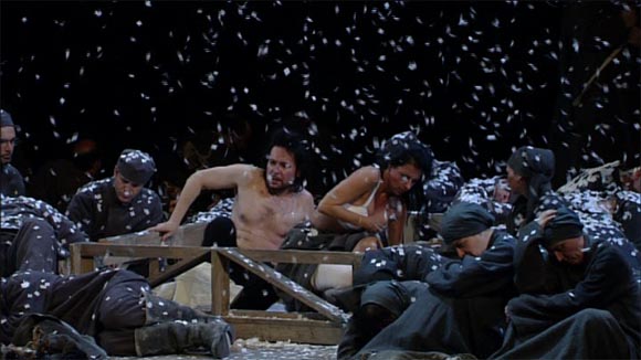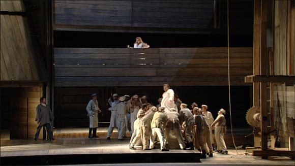 The production is fairly conventional. A wooden set serves variously as the interior of the Izmailov’s warehouse, the police station, some external scenes and, with minor changes, the convict’s camp. There are various galleries and a sort of eyrie that serves as Katerina’s bedroom. The production is not particularly exciting. The seduction/rape in Act 1 is depicted by Katerina’s bedroom light swaying increasingly wildly while a minor character clowns across the stage. It really stays in much the same key until Act 4 where everything goes blue and white and “snow” pours down continuously onto the stage. Sergei and Sonyetka get it on under a big white sheet while the rest of the convicts look on. The push/jump into the river happens so suddenly and unobtrusively that if one didn’t know the plot one might miss it.