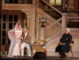 First up in my research project ids a 1996 production from the Seefestspiele Mörbisch. Since this festival claims to be the operetta capital of the world and is only 60km from Vienna I thought it might be along the lines of going to Stratford to see Shakespeare. The Seefestspiele is situated on the banks of the Neusiedler See and features a 6000 seat “audience park” overlooking a very large stage/set actually on the lake so obviously it’s not a normal opera house setting. In this production by Elmar Ottenthal the huge area available is used to stage the big set pieces in Act 2 but otherwise a very restricted area of the stage is used for the main action. There seems to be quite a lot of background business in Act 2 but the video director (Georg Madeja) rarely lets us see it.