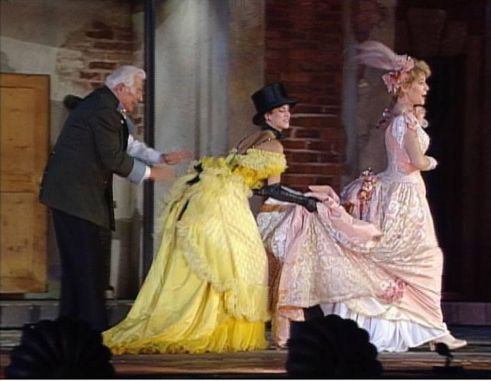 The singing and acting is pretty good if very varied in style. The Alfred of Tomas Lind is very much a light musical theatre type voice and he rather camps up the “anyone for tennis” approach.i Ute Gfrerer’s Adele is a typical soubrette soprano. She’s got a pleasant voice, her colotura is lively and accurate and she acts very well. The genuine operatic component is supplied by Peter Edelmann as Eisenstein and Silvana Dussmann as Rosalinde backed up by Waldemar Kmentt as the prison governor. All three are solid opera professionals if not exactly international stars and they all sing and act very well. Edelmann is surprisingly athletic while Dussmann comes across as very much the diva. Orlofsky is played by a counter-tenor, Artur Stefanowicz. I didn’t much like his rather thin toned voice or stiff acting and I’m not convinced that there is any good reason not to use a mezzo in the role. Rudolph Bibl conducts the Symphonie-Orchester Burgenland and the Chor der Seefestspiele Mörbisch. It’s not the most demanding score in the world and it all sounds fine.