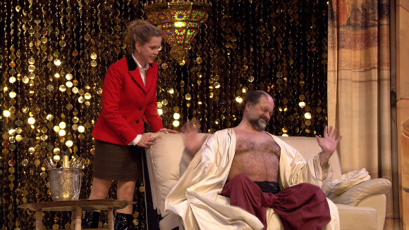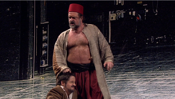 The production, directed by Johan Simons, uses fairly uncluttered sets and costumes that switch between pantomime Aladdin and, most of the time, modern dress. The take on the characters is interesting. Osmin is pretty much the classic infatuated old Turk, played brilliantly by Kurt Rydl, but the infatuation is reflected by the distinctly dominatrix like Blonde played by the rather lovely Mojca Erdmann in kinky boots, a tight short skirt and a belt that she’s quite prepared to use on the men in her life. At least in the first two acts there’s plenty of ambiguity in Laura Aikin’s Konstanze. Is she actually at least a little bit in love with Bassa Selim, played very well by Martin van Westmeulen. Certainly she has him twisted around her little finger and in Martern aller Arten seems to be very much “topping from the bottom”. To round the cast out, Michael Smallwood is a cheeky chappy Pedrillo, very much under Blonde’s thumb and Edgaras Montvidas is a suitably sappy Belmonte. It’s mostly fast paced good fun but does strike a more serious note in the final scenes. Funny how that always seems to happen with Mozart “comedies”.
