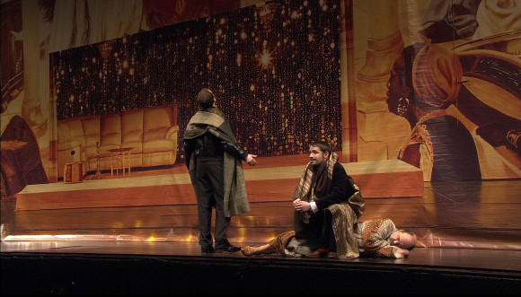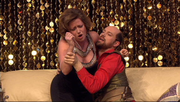 Musically it’s pretty good too. Constantinos Carydis conducts a fast paced and nimble reading from the Netherlands Chamber Orchestra. The vocal star is clearly Laura Aikin who has the difficult coloratura parts of Konstanze’s music nailed. This is particularly praiseworthy as she does it while doing some pretty intense physical acting. It can’t be easy to nail Martern aller Arten with Bassa Selim firmly lodged in your cleavage. The men are perfectly adequate. I thought Michael Smallwood was particularly sweet toned. The one weakness, and I hate to say this, was Mojca Erdmann. Her upper register is a bit harsh and shrill. This is surprising as most reviews of Ms. Erdmann praise her beauty of tone. Maybe she was just pushing a little too hard in this performance. The ensemble work was generally first class.