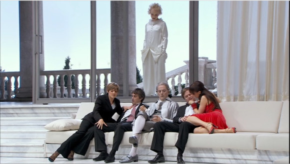 The 2013 production of Mozart’s Così fan tutte from Madrid’s Teatro Real is one of German film director Michael Haneke’s comparatively rare forays into opera. Naturally I was expecting a highly conceptual interpretation but, although his vision is far from conventional, Konzept found I not. What I saw was a collection of ideas that didn’t quite cohere for me. Costume and sets are a mix of 18th century modern. We are in Don Alfonso’s inconsistently modernised mansion. There are enormous 18th century paintings and chandeliers but also leatherette banquettes and the Giant Fridge of Booze. The boys and girls wear contemporary party attire, including a rather fetching red dress for Fiordiligi, but Don Alfonso is in full 18th century gard and Despina seems to be dressed as Pierrot. Perhaps it’s some sort of party where some of the guests have decided to do the costume thing and some haven’t? When the boys go off to the army they do so in some sort of distant past opera version of military uniform; wigs and swords.