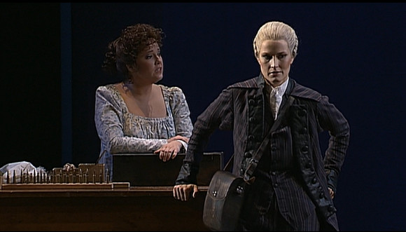I’m really not sure what to make of Jürgen Flimm’s 2004 production of Fidelio for the Zürich Opera House. It’s not offensive and it doesn’t really get in the way of the story but it seems quite devoid of originality beyond mixing styles in a way one might describe as anachronistic if one could figure out when synchronistic would be. Rocco wears a sort of frock coat with, apparently, goatskin pants, Marzellina’s dress looks probably 20th century, bolt action magazine fed rifles are apparently muzzle loaded and metal cartridge cases filled by hand. Then to cap it off when Don Fernando shows up he looks like he’s stepped straight out of a Zeffirelli production of Der Rosenkavalier. So “nul points” for coherence. For once one rather appreciates that so much of the action takes place in the dark.
