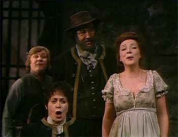 Britten’s Albert Herring is mysteriously under represented in the DVD catalogue. The work is performed quite often being relatively inexpensive to mount and suitable for smaller venues but the many productions haven’t led to many recordings. I have only been able to find one and that dates back to 1985 when it was recorded at Glyndebourne. That’s appropriate enough as that’s the house the piece premiered in in 1947. At least it’s a fair and effective representation of the work. Peter Hall’s production takes few liberties with the libretto and is a rather literal and effective, if necessarily somewhat caricatured, representation of life in a Suffolk village. The sets and costumes are evocative; especially the hall of Lady Billows’ house which really evokes a 17th century Great Hall and, as the view through the window tells us, is set in or close to the village, not in an isolated park. There’s quite a lot of that kind of attention to detail in this production.