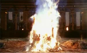 The hunt scene has dogs and spears and a real boar’s head (which Aeneas touchingly present to Dido in her bath). There is a lot of fire including a full blown pyre at the end. For all that it doesn’t seem any more “true” than Wayne McGregor’s much sparer vision. It’s also very emotionally restrained. It’s not really until the final confrontation between Aeneas and Dido that any real emotion intrudes and even then it’s quite restrained This is actually very effective and Maria Ewing is truly affecting in the final couple of scenes. Ewing is good throughout both in the singing and acting department and her looks help (OK I know not everyone goes for Ewing but I think she’s gorgeous!). Karl Daymond is fine as Aeneas.