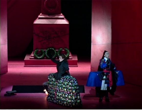 Handel’s Giulio Cesare is pretty well served in terms of video recordings. The very fine Glyndebourne and Copenhagen versions get some serious competition from the 2012 production that inaugurated Cecilia Bartoli’s reign as director of the Salzburg Whitsun Festival. The production is by Moshe Leiser and Patrice Caurier. It’s set in somewhere like Iraq in an immediately post-war period. It’s quite dark, probably darker than Negrin’s in Copenhagen and world’s away from McVicar’s almost RomCom version. There’s a lot of violence and some pretty sleazy sex. A lot of this centres around Tolomeo who is portrayed as beyond revolting. There’s a scene where he rips guts out of a statue of Caesar and starts to gnaw on them and there is a fair bit in that vein. Caesar and Cleopatra are portrayed ambiguously too. Sure they are the “heroes” of the piece but Cleopatra’s delight in flogging off her country’s oil wealth to the Romans shows a degree of cynicism. This is not a production for the Konzept averse but I think all the choices made have a point and the overall effect is coherent. It’s not without humour either. Cleopatra sings V’adore pupille in a 70s blonde wig while riding a cruise missile with Caesar watching through 3D glasses.
