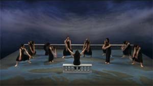 The piece is played out on an elegant blue and grey stage and backdrop with a (very) few white props as required and all the dancers are dressed very simply in black so the look is very spare but very elegant. The choreography (by Mark Morris) is of a school of modern dance that I don’t really understand. It’s almost like a parody of one’s idea of modern dance. At times overly literal, at others very jerky and inelegant. It certainly doesn’t have much in common with ballet, even of the more abstract modern variety.