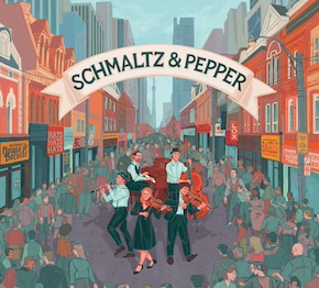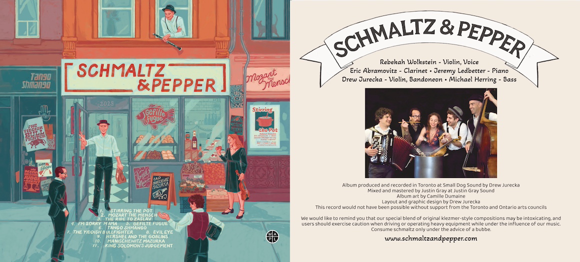 Schmaltz and Pepper is a comparatively newly formed band (November 2023) but it contains quite a few familiar faces; Rebekah Wolkstein (vocals, violin) and Drew Jurecka (vocals and assorted instruments) from Payadora, Eric Abramowitz (clarinet) from the TSO plus multitalented Jeremy Ledbetter (piano) and Michael Herring (double bass). Between them they have backgrounds in classical, klezmer, tango, calypso, Yiddish swing, jazz and much more. The focus of the new band appears to be klezmer and Yiddish swing but since most of their material is original there are lots of influences.