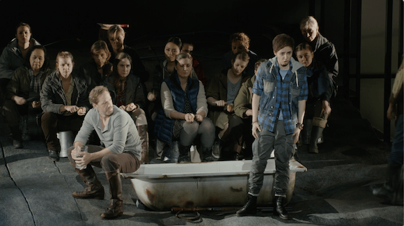 Robert Carsen’s 2021 production of Monteverdi’s Il ritorno di Ulisse in patria was recorded at the Teatro della Pergola during the Maggio Musicale Fiorentino. The theatre, opened in the 1660s and very much a “renaissance theatre”, is very much part of the production; the loge boxes are used during the prologue, entrances are made through the unusual parterre (individual chairs not rows of seats) and the gallery behind the stage is used by the gods to observe the action below. Monteverdi used three distinct styles of music for gods, royals and lesser folk, Carsen mimics this by giving the three orders distinct costume and acting styles. The gods (and there is the full pantheon, not just the ones who appear in the opera, each with his or her distinctive emblem), costumed in opulent crimson 16th century style costumes, act in a stylised manner. The royals get smart modern dress and naturalistic acting while the others are scruffier and act more broadly.