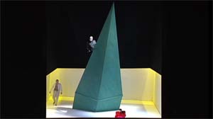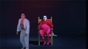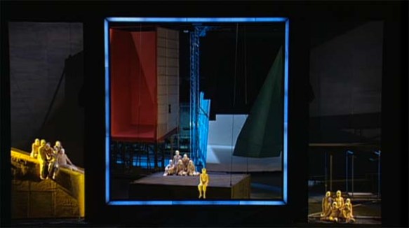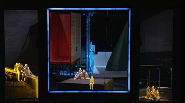 Director and designer Peter Mussbach offers us a largely abstract expressionist staging. Each scene takes place in a cube at centre stage, framed in neon and populated for the most part by a few shapes in primary colours. Only at the beginning of Act 3, where Wozzeck watches Marie “betray” him with the Drum Major does it just for a moment bend towards a more naturalistic aesthetic. Costumes are similarly stark. The Hauptmann in particular wears something that looks like a red and pink chicken suit with epaulettes whereas Wozzeck is dressed in a simple white (almost) shirt and trousers. Only the drum major gets the almost realistic over the top military tailoring look. In the transitions between acts a cube filling, well, cube, apparently made of breeze block or cork or some similar textured substance, appears and spins around and does stuff before dropping back to give us a new cube set. Only right at the end are there characters or scenery outside the cube, albeit grotesquely masked children, as the camera pulls back to reveal the whole artifice of the stage machinery. It’s hard to describe but it does work rather well.