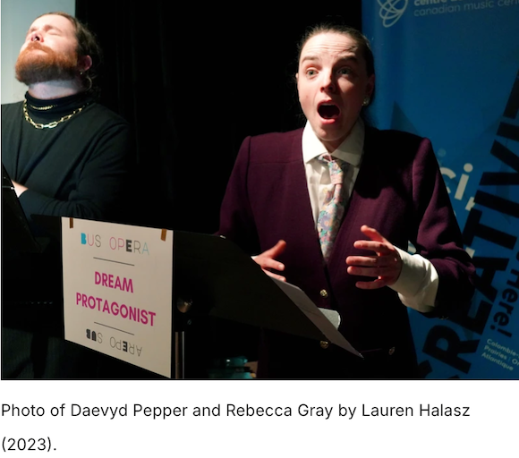 Rebecca Grey is a composer with a very individual view of the world and her art. Who else would write operas about nightmares on an overnight bus trip or about a savvy racoon taking on a rapacious Toronto landlord? Or, for that matter, cycle the Highway of Tears? Her most substantial project to date is Bus Opera. I first saw a workshop of an early version of it at the CMC a couple of years ago followed by a performance of extracts at one of New Music Concerts’ MAKEWAY concerts for early career creators at St. George by the Grange a few weeks later. So I was very happy when I was offered the chance to attend a workshop performance of the (pretty much) complete work at Hugh’s Room on Tuesday night.