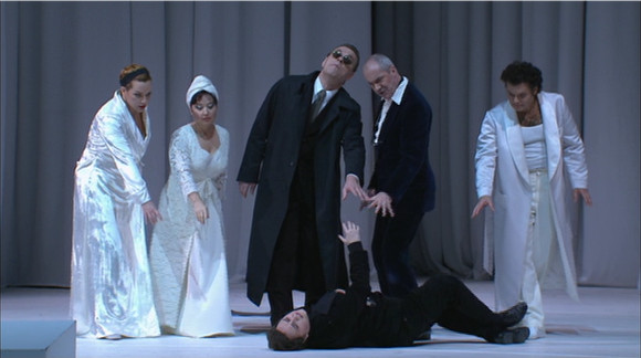 Claus Guth’s 2006 production of Ariadne auf Naxos recorded at the Opernhaus Zürich in 2006 is a compelling piece of theatre. It’s one of those Regietheater pieces that combines a workable concept with compelling Personenregie to create a whole that’s extremely illuminating. The entire Vorspiel is played out, in modern dress, in front of a grey curtain. We get an immediate idea of how Guth is going to explore/exploit metatheatricality as soon as the Haushofmeister appears. He’s played by none other than Zürich Intendant Alexander Pereira. Who is calling the shots? This is reinforced when he drops the bombshell that the opera seria must be combined with Zerbinetta’s farce. This speech is delivered by Pereira from among his guests in the Intendant’s box. It’s very clever. But there’s so much more going on during the Vorspiel. The Komponist is getting seriously deranged; perhaps even more so after he begins his infatuation with Zerbinetta. There’s a moment when it looks like a love triangle is being set up. The diva just gives one look that suggests that she’s got her eyes on the Komponist. It’s a typical moment. A look, a gesture, seems to convey so much. It all concludes with the deranged Komponist shooting himself.