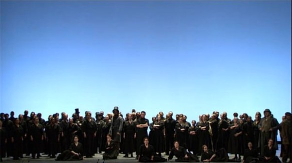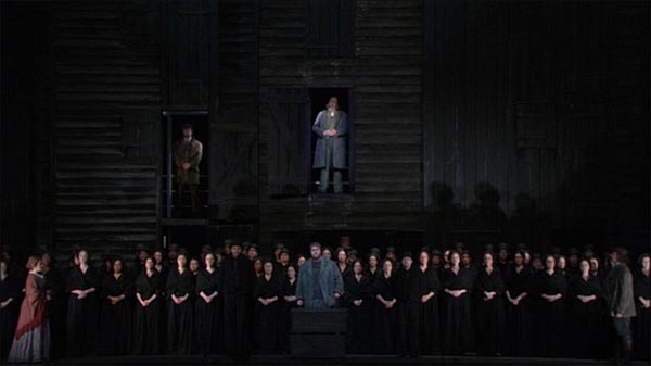 The video director, Gary Halvorson, appears either to hate the production or think that the cinema/DVD audience is too thick to get it because he relentlessly undermines it. Unable to present the dark, stark stage that Doyle has called for he gives us a compilation of super closeups and really weird camera angles; pointing up from the side of the pit, pointing down from what looks like the cheapest seats at the outermost edge of Ring 4 and so on. He also can’t accept that the director doesn’t want to distract from the music during the Interludes so we get a succession of close ups on audio members and, more especially, on conductor Donald Runnicles. This is particularly unfortunate as Runnicles conducts like a hyperactive and self regarding pterodactyl.