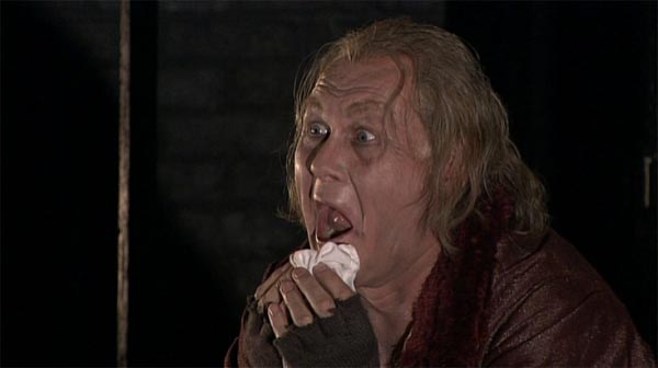 This work lasts only a little over an hour and is split into three scenes which scarcely relate to each other. In Scene 1 a young knight laments that he can’t keep up his social position on his meagre allowance. A Jewish moneylender refuses to extend further credit but suggests that he can provide the knight with poison if he wants to do his old man in. The knight refuses. Act 2 consists of a monologue in which the father, the Miserly Knight of the title, rhapsodizes over his six chests of gold in a fairly overtly sexual way for twenty five minutes. In Scene 3 the Duke orders the father to make an appropriate allowance to his son. The father refuses ultimately claiming, ironically, that his son is trying to poison him. The son rushes in and denounces his father. They have a row and the father drops dead. End of story. All this takes place to an incredibly complex score full of leitmotivs. In a real sense the orchestra is the main character, functioning as Chorus in the original Greek sense. How to bring some sense of the dramatic to this is no mean problem. Arden’s solution is to embody Greed in the form of an aerialist who is present whenever the father is present. This seems like a great idea and on the odd occasion the video director lets the DVD audience see the interaction between Greed and the father it seems to work. Unfortunately the video director, Franceska Kemp, is even more wedded than most of her ilk to superfluous close-ups and so most of Arden’s intelligent work is lost on us.