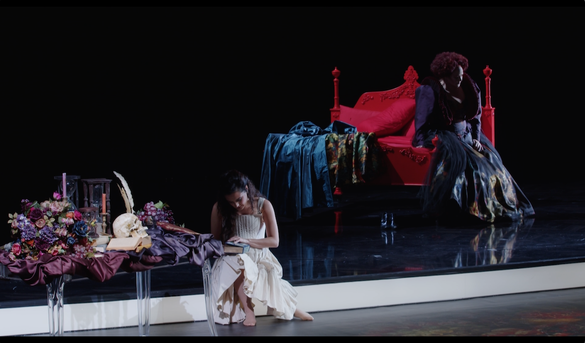 Stephen Langridge’s production of Donizetti’s Roberto Devereux recorded at the Donizetti Festival in Bergamo in 2024 is heavy on death symbolism. The general look of the sets is fairly abstract with a sort of light box with a gallery and a few bright red elements; the throne, the Nottinghams’ bed and so on, but there are skulls and other memento mori everywhere. Costuming is sort of operatic Tudor but Elisabetta’s dress is a print that includes skulls and she’s doubled by a human size, identically dressed, Death puppet. As seems to be the fashion, much of the time only the front of the stage is lit leaving characters lurking in the gloom upstage.