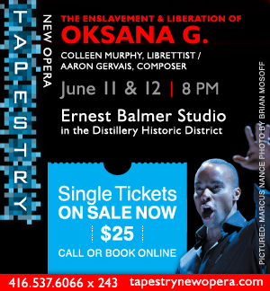 Last night saw the first of two workshop performances of Act 2 of The Enslavement and Liberation of Oksana G., a new full scale opera with music by Aaron Gervais and libretto by Colleen Murphy. Act 1 was similarly workshopped last year. It’s being produced by Tapestry New Opera in the Ernest Balmer Studio at The Distillery. The second performance is tonight.