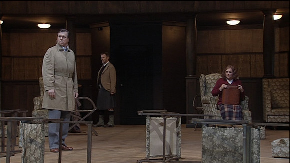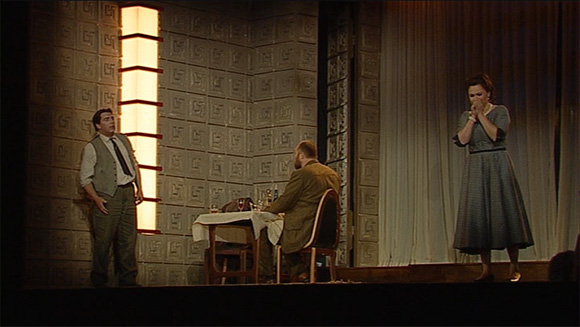 Christoph Marthaler’s 2009 Bayreuth production of Tristan und Isolde is set in a sort of Stalinist brutalist aesthetic populated with stock figures from the 1950s.  Passion is at a minimum and the characters all seem to be trying as hard as possible to be conventional representatives of their roles.  The only one who shows any real human engagement is Kurwenal who comes across almost as a commentator on the action, or even a director.  There’s also some fairly stylized gesturing in a sort of pseudo-Sellars manner.  It’s epitomised by the costumes in Act 2 where Isolde and Brangäne look like dolls dressed as Hausfraus and Tristan wears a hideous blue blazer.  This is all rather reinforced by Michael Beyer’s video direction which uses a lot of close ups but also has a curious stillness about it that seems to amplify the emotional void; if indeed one can amplify a void.  Oddly though, in places this approach really works in that the distance, coupled with very precise blocking, gives space for the music’s essential intensity to come through.  Act 2 Scene 2, perhaps the emotional crux of the piece, is very moving and the So stürben wir, um ungetrennt is quite impressive.