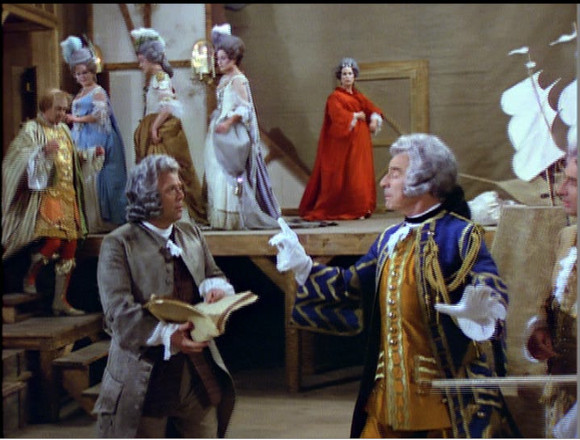 Herbert Fritsch’s production of Rossini’s Il barbiere di Sivigla filmed at the Wiener Staatsoper in 2021 is strangely ambiguous. At first blush it looks like the sort of hyper traditional production the WSO might have had in repertory for fifty years. There are big wigs, knee breeches and so on but it soon becomes apparent that something more (or less) is going on. Tje costumes are exaggerated. The fabrics are elaborate and shiny and very not early 19th century at all. The wigs are odd colours. Rosina’s dress shows rather a lot of leg. There’s virtually no scenery and the only props I recall in the whole piece are a ladder and Lindoro’s sword at the end of Act 1.