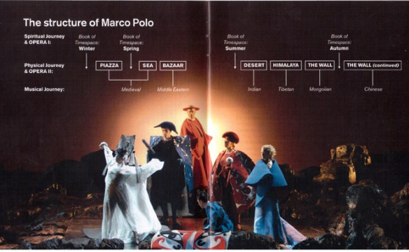 Tan Dun’s Marco Polo is hugely ambitious. He uses Marco Polo’s legendary journey as a metaphor for Space and Time.  He fuses a range of Western musical styles with Chinese, Tibetan and Indian instruments and vocal styles.  Although most of the work is sung in English there are sections in Italian and Chinese and other bits in a sort of random polyglot.  The cast includes a range of real, allegorical and psychological figures.  Marco and Polo are in fact two characters; one representing action and the external and the other the psychological and internal.  Kublai Khan, Dante, Shakespeare, Sheherazada and Mahler put in appearances and much of the narrative is carried by a Chinese opera singer playing the part of Rustichello; “the questioner”.  To be honest, despite having read the booklet, watched Reiner Moritz’s “Making of” documentary and studied the chart below, most of the time I had no idea what was actually happening.  It’s really all too abstract and involved to really work as music drama.